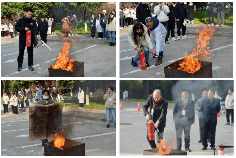 疏散演练完毕后,学院在格物楼门前广场组织了灭火器使用实战培训活动。应急演练组的成员向参与演练的师生详细展示了实验室常用的干粉灭火器、二氧化碳灭火器以及灭火毯等消防器材的功能特性和正确使用方法。通过讲解和示范,师生员工对各类消防器材有了更深入的了解。在应急演练组成员的指导下,参演师生纷纷上阵,亲自实践操作灭火器,将理论知识转化为实际操作技能。这一环节不仅增强了师生们的消防安全意识,也提高了他们在紧急情况下应对火灾的实战能力。