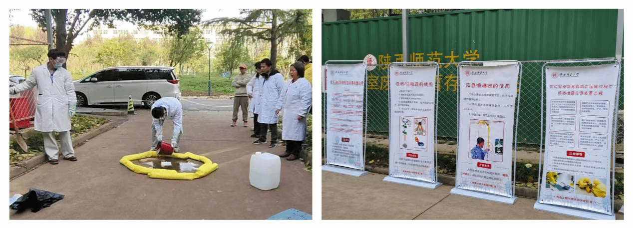 随后,学院开展了危险试剂倾洒应急处置项目培训,向各科研实验室的学生安全员们模拟演示了有机废液和酸性试剂泄露事故的规范化应急处置全过程。演示中,老师详细讲解了泄露事故发生后应采取的紧急措施,包括如何迅速隔离泄露源、如何佩戴个人防护装备、如何选择合适的应急处理材料等,为现场的学生安全员们提供了宝贵的实践经验。本次培训不仅提高了学生对实验室危险废弃物管理的重视程度,也增强了学生在应对类似泄露事故时的应急处置能力。