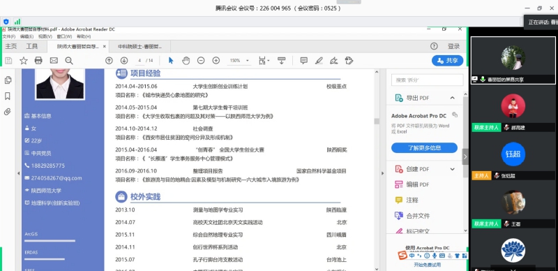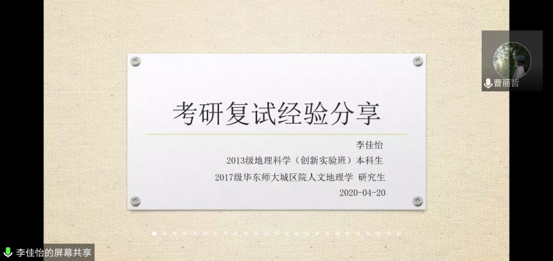 2013级地理科学创新班李佳怡(就读于华东师范大学)、14级地理信息科学党星星(就读于陕师大)、2013级地理科学创新班曹丽哲(就读于中科院地理所)、2014级地理科学创新班胡宝怡(就读于中科院青藏所)、2015级环境科学郭倩楠(就读于清华大学)、2015级环境科学武雅妮(就读于西安交通大学)、2015级环境科学左铃(就读于陕师大)等7位优秀校友在线分享。学院党委副书记郝高建、团委书记王蓓蓓、辅导员张钰超及学院考研、复试的100余名同学参加了交流会。会议由团委书记王蓓蓓主持。