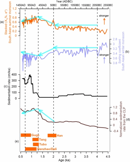 图4 佛掌沙丘黄土记录的南亚季风和粉尘活动的变化及其与黄土高原粉尘活动的变化和朝代王国兴衰时段的对比