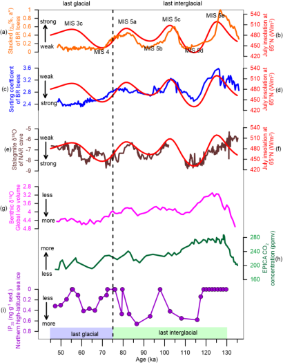 基于林芝市境内比日神山的1个4.3 m的黄土剖面,通过高密度(20 cm间隔)钾长石红外后高温红外释光(pIRIR)测年技术(图2),结合粒度分选系数、色度和磁化率指标,重建了末次间冰期(130-75 ka,1 ka代表公元1950年前1千年)南亚夏季风和冬季风的变化。结果表明,南亚夏季风和冬季风在轨道尺度上呈反相位的变化关系。从深海氧同位素(MIS)5e,MIS 5c到MIS 5a,南亚夏季风的强度逐渐减弱(图3),明显有别于天门洞石笋δ18O反映的南亚夏季风强度的变化,天门洞石笋δ18O在MIS 5e,MIS 5c和MIS 5a阶段几乎没有区别。南亚冬季风大体与南亚夏季风强度呈现反相位的变化,从MIS 5e,MIS 5c到MIS 5a逐渐增强,另外MIS 5d的南亚冬季风明显要强于MIS 5b。进一步分别与65°N和25°N七月太阳辐射曲线对比发现,不管是变化幅度还是变化趋势,较强的南亚夏季风和较弱的南亚冬季风都对应较高的65°N七月太阳辐射,而在变化幅度上,南亚夏季风和南亚冬季风明显有别于25°N七月太阳辐射。进一步认为65°N七月太阳辐射可能通过海冰的反馈影响了北半球冬季和夏季温度,从而影响了南亚夏季风和南亚冬季风。米兰科维奇理论认为65°N夏季太阳辐射通过调节北半球冰盖的变化从而影响全球的气候,因此本研究支持了米兰科维奇理论。