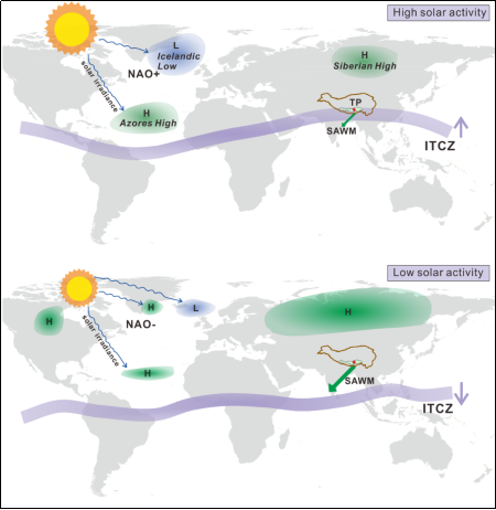 青藏高原,作为全球粉尘的重要源区,然而对其地质历史时期粉尘活动的演化过程与驱动机制仍不清楚。基于山南市贡嘎县境内1个4.8米黄土剖面,通过综合两台不同型号的释光测年仪器(Lexsyg和Risø)高密度(40 cm间隔)的中颗粒石英OSL的年代结果,结合粒度和磁化率指标,重建了早全新世雅江流域粉尘活动的变化。结果发现,早全新世粉尘活动频率的变化与北大西洋冰筏事件、NAO的相位以及太阳活动强弱有着较好的对应关系,认为较弱的太阳活动导致较弱的北大西洋温盐环流、较频繁的冰筏事件以及偏负的北大西洋涛动,进一步加强了南亚冬季风和引起了较频率的粉尘活动(图5)。