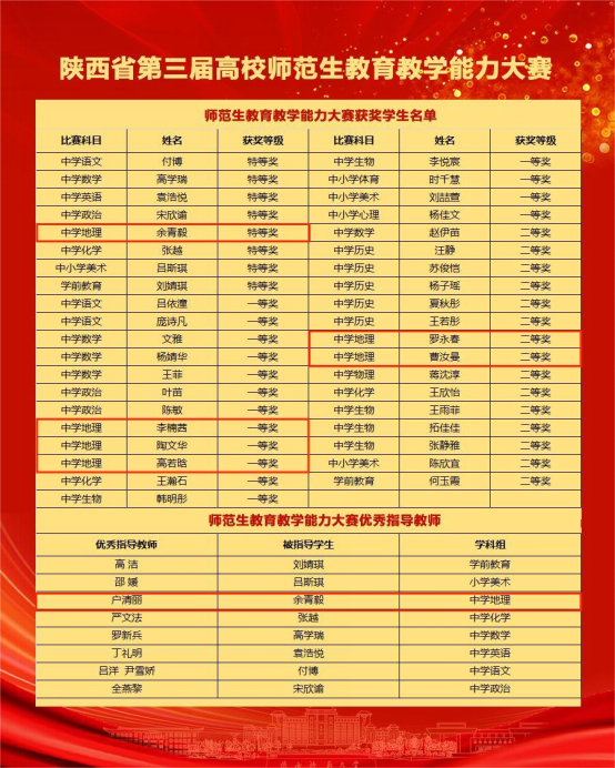 2021级本科生余青毅荣获特等奖,2021级本科生李楠茜、高若晗和2020级本科生陶文华荣获一等奖,2021级本科生罗永春、曹汝曼荣获二等奖。户清丽老师获评中学地理组优秀指导教师。