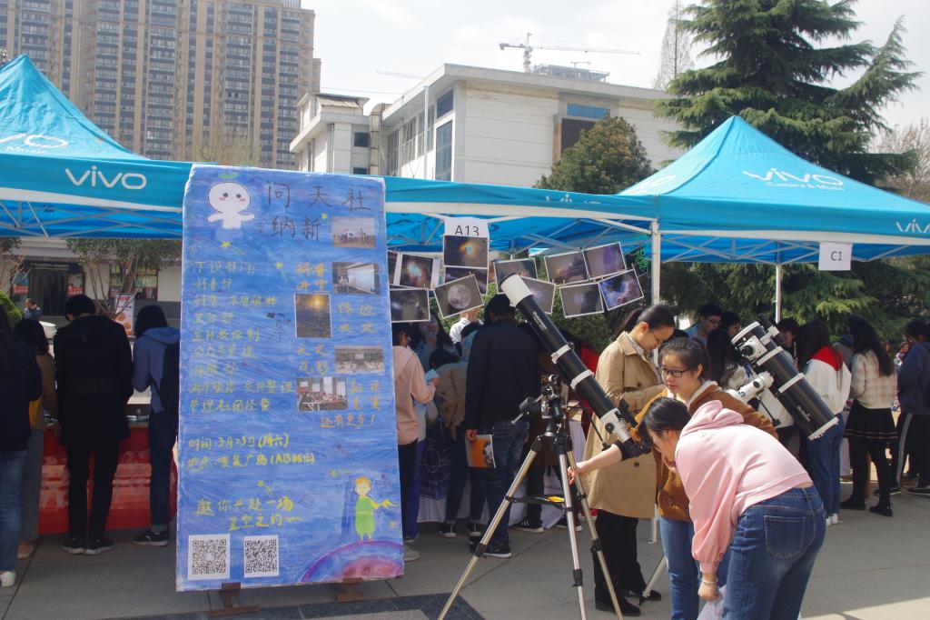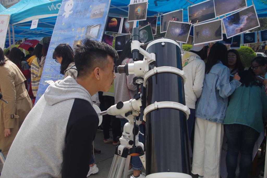 活动当天天气晴朗,阳光灿烂,这使我们社团的天文望远镜也派上了用场。我们在望远镜镜头处安装了专用的巴德膜,这样就可以直接观测亮度极高的太阳表面。在社团同学专业的操作下,两台望远镜很快便对准了目标,当耀眼的太阳盘面出现在目镜的视野当中时,观测的同学们都欢呼起来。在因巴德膜滤光作用下呈亮白色的太阳表面上,几个太阳黑子清晰可见。这一神奇的天象吸引了大量路人驻足观看,不少同学表示他们都是第一次亲眼见到这种以前只在课本上见过的天文奇观。