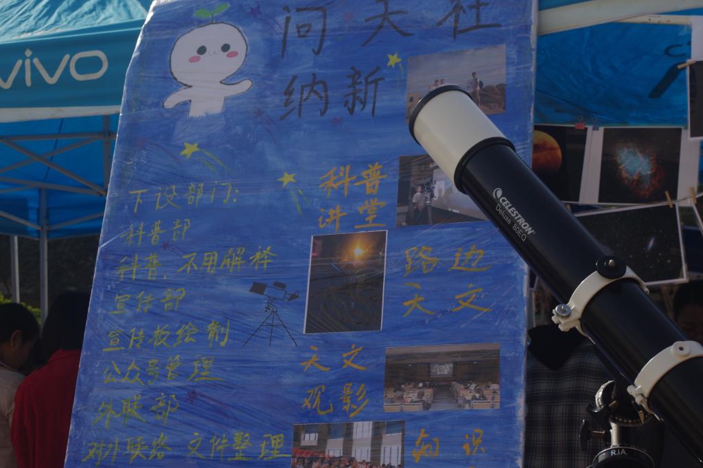 上午团成员早早来到了活动现场开始布置,准备器材、资料,包括社团的天文望远镜、天球仪、活动星图、社团成员的摄影作品、历次社团活动的照片等。社团的工作人员为大家准备了趣味十足的小游戏——对照着我们给出的星图在明信片上用小塑料球摆出属于自己的星座图案。神秘的星座和美丽的星图极大地激发了参与人员的兴趣,在完成属于自己的星座明信片后同学们可将其带走,这很有纪念意义。