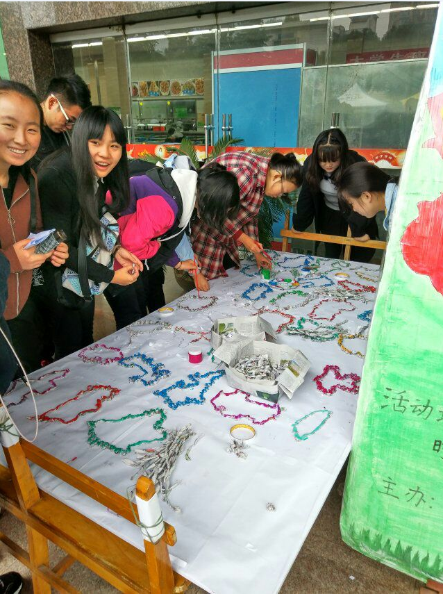 的专业特色和环保理念,地理学社与环保DIY社团于2017年10月16日联合举办了“将环保绘进地图”活动,吸引校内大量同学前来参加体验用旧报纸绘制中国各省份。