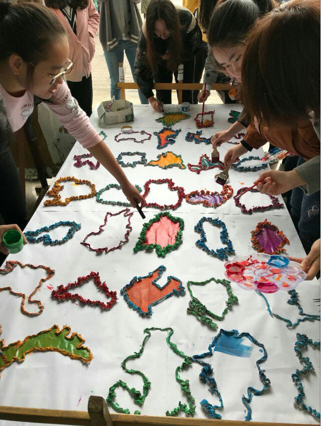 地理学社与环保DIY社团工作人员事先把中国各省的轮廓用铅笔画在板子上,然后第一波参加活动的人用报纸条或报纸球在轮廓上粘一圈,使图显得立体一些第二波参加活动的人用彩笔把报纸轮廓涂上颜色,第三波参加活动的人用刷子在各个省份轮廓里面涂上颜色,最后,在每个省份旁边写上他们的简称。