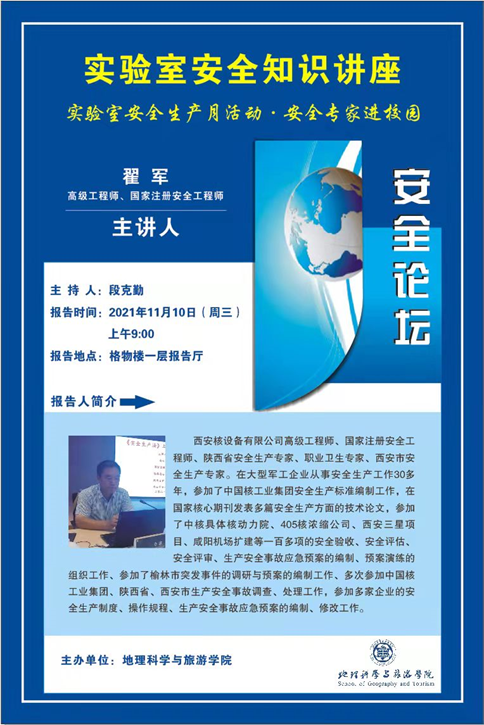 作为2021年实验室安全生产月重要活动内容之一:安全专家进校园,实验中心邀请到了我市安全应急管理专家、国家注册安全工程师翟军老师,针对91九色 各类实验室存在的安全隐患进行一次专项讲座,欢迎广大师生前来参会。