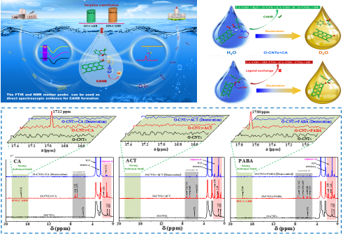 进展一:证实了电荷辅助氢键(CAHB)在碳质材料吸附去除及固持可解离有机污染物(IOCs)中的关键作用,并获得了CAHB形成的分子学层面上的直观光谱学证据